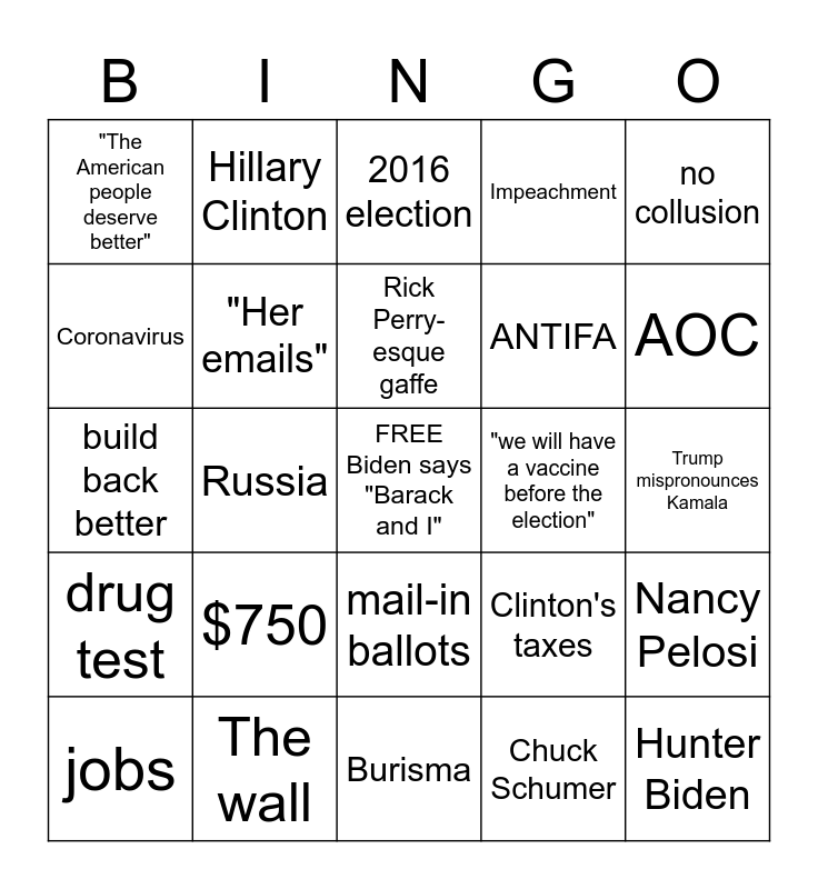 This bingo card has a free space and 50 words: Malarky, Hunter Biden, Sleepy Joe, Burisma, $750, New York Times, Hillary Clinton, Q Anon, Coronavirus, "The China Virus", "Her emails", Impeachment, Nancy Pelosi, Clinton's taxes, Amtrak, Rigged election, Rick Perry-esque gaffe, "we will have a vaccine before the election", "there you go lying again", no collusion, Russia, Chuck Schumer, "The American people deserve better", ANTIFA, Hoax, defund the police, AOC, The Squad, 2016 election, mail-in ballots, Discarded PA ballots, Naked ballots, Law and Order, Ruth Bader Ginsberg, The wall, YUGE, Obamacare, Pre-existing conditions, Cuomo, Trump mispronounces Kamala, "Folks, here's the deal", Trump says that a question is "nasty", Socialism in Venezuela, Trump calls Bernie a socialist, jobs, build back better, make America great again, stock market, drug test and Trump Sniffles.