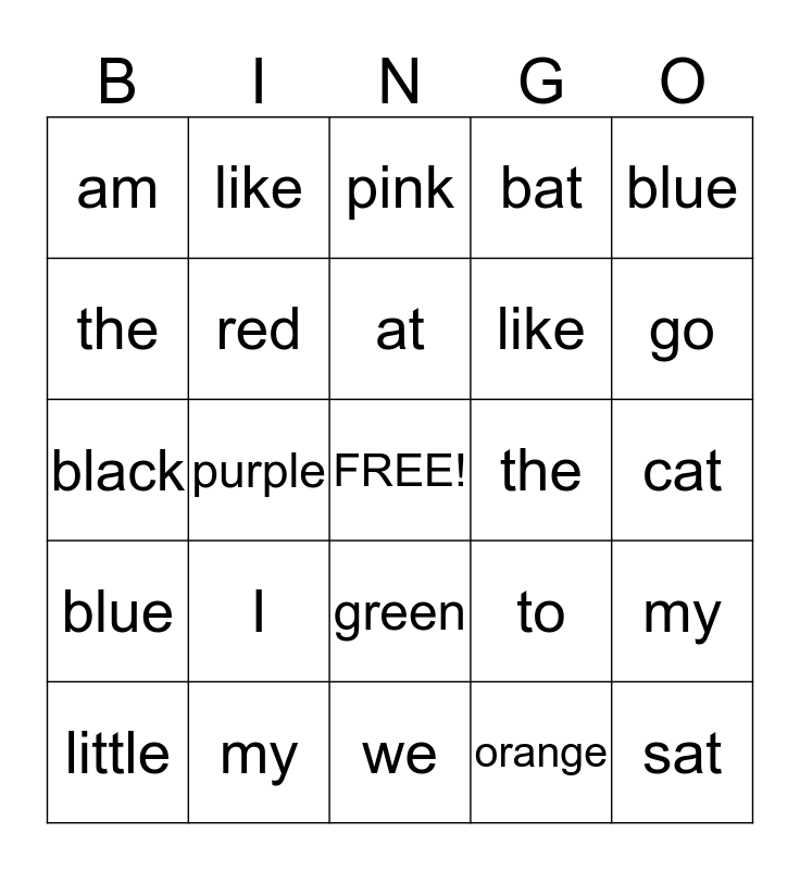 This bingo card has a free space and 24 words: I, my, at, little, blue, am, the, like, the, green, like, black, to, my, red, orange, cat, pink, go, purple, sat, blue, bat and we.