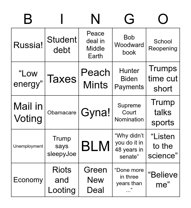 This bingo card has a free space and 24 words: Trump says sleepyJoe, Riots and Looting, Peach Mints, Economy, School Reopening, Russia!, “Low energy”, Student debt, Supreme Court Nomination, BLM, Hunter Biden Payments, Mail in Voting, “Why didn’t you do it in 48 years in senate”, “Listen to the science”, Taxes, “Done more in three years than ...”, Trump talks sports, Peace deal in Middle Earth, Trumps time cut short, Obamacare, “Believe me”, Unemployment, Bob Woodward book and Green New Deal.