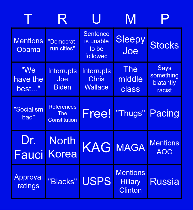 This bingo card has a free space and 39 words: Fake News, Epstein, "China Virus", Interrupts Joe Biden, Approval ratings, KAG, Interrupts Chris Wallace, Mail-in voting, Stocks, Dr. Fauci, References The Constitution, Sleepy Joe, Russia, Pacing, "Thugs", North Korea, The wall, Mentions Obama, False COVID stats, MAGA, "We have the best...", USPS, The middle class, Says something blatantly racist, Live Fact Check, Yuge, Mentions Nancy Pelosi, Admits to something illegal, Swearing, "Democrat-run cities", Job creation, Avoids the question, Sentence is unable to be followed, "Blacks", Mentions Hillary Clinton, American exceptionalism, Mentions AOC, "Socialism bad" and Mentions Bernie Sanders.