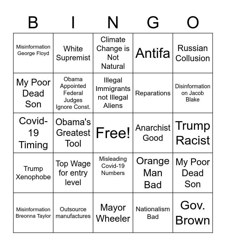 This bingo card has a free space and 34 words: Trump Taxes, Nationalism Bad, 11 million Illegal Aliens, Peaceful Protesters, Trump Xenophobe, Obama Appointed Federal Judges Ignore Const., Russian Collusion, Misinformation Breonna Taylor, White Supremist, Guns Kill Except Police Kill Not the Gun, Illegal Immigrants not Illegal Aliens, Climate Change is Not Natural, Marxism Good, Social Securtiy Disinformation, Anarchist Good, Disinformation on Jacob Blake, Outsource manufactures, Covid-19 Timing, Top Wage for entry level, Orange Man Bad, Misleading Covid-19 Numbers, Don't make Walls, Misinformation George Floyd, Trump Racist, Mayor Wheeler, Gov. Brown, Antifa, BLM Looter, Reparations, My Poor Dead Son, My Poor Hunter Biden, Obama's Greatest Tool, My Poor Dead Son and Claimed to give a thriving economy.