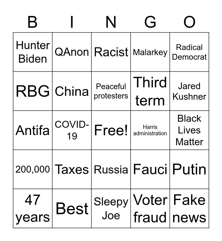 This bingo card has a free space and 24 words: Taxes, Best, Peaceful protesters, 47 years, Radical Democrat, Hunter Biden, RBG, QAnon, Harris administration, Russia, Third term, Antifa, Fauci, Putin, China, Voter fraud, Black Lives Matter, Racist, Jared Kushner, COVID-19, Fake news, 200,000, Malarkey and Sleepy Joe.