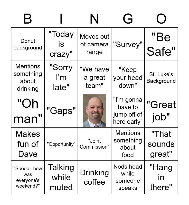 This bingo card has a free space and 24 words: "Opportunity", Talking while muted, "We have a great team", "Soooo...how was everyone's weekend?", "Be Safe", Donut background, Mentions something about drinking, "Today is crazy", "I'm gonna have to jump off of here early", "Joint Commission", "Keep your head down", "Oh man", Mentions something about food, "That sounds great", "Sorry I'm late", Nods head while someone speaks, "Great job", Moves out of camera range, St. Luke's Background, "Gaps", "Hang in there", Makes fun of Dave, "Survey" and Drinking coffee.