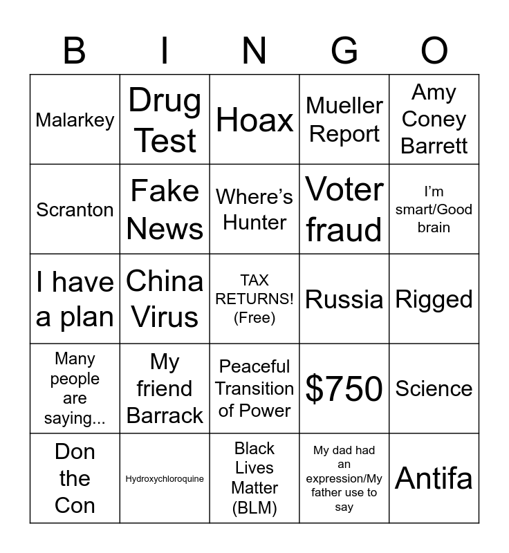 This bingo card has a free space and 29 words: Don the Con, Sleepy Joe, China Virus, Nasty/Disgusting, Malarkey, Hoax, Fake News, My friend Barrack, Russia, Hydroxychloroquine, Rigged, Antifa, Black Lives Matter (BLM), My dad had an expression/My father use to say, I’m smart/Good brain, Ruth Ginsburg, Peaceful Transition of Power, Many people are saying..., Amy Coney Barrett, I have a plan, $750, Mail in ballots, Voter fraud, Scranton, Mueller Report, Drug Test, Science, Where’s Hunter and Let me be clear.