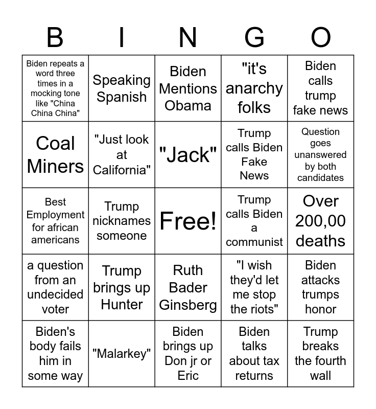 This bingo card has a free space and 24 words: Trump brings up Hunter, "Malarkey", "Jack", Biden's body fails him in some way, Biden calls trump fake news, Biden repeats a word three times in a mocking tone like "China China China", Coal Miners, Speaking Spanish, Trump calls Biden a communist, Ruth Bader Ginsberg, Trump calls Biden Fake News, Best Employment for african americans, "I wish they'd let me stop the riots", Biden attacks trumps honor, "Just look at California", Biden talks about tax returns, Over 200,00 deaths, Biden Mentions Obama, Question goes unanswered by both candidates, Trump nicknames someone, Trump breaks the fourth wall, a question from an undecided voter, "it's anarchy folks and Biden brings up Don jr or Eric.