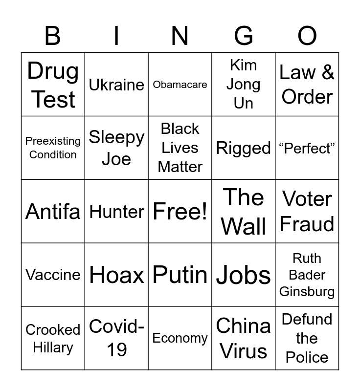 This bingo card has a free space and 32 words: China Virus, Tax Returns, Hunter, Fake News, Vaccine, Sleepy Joe, Law & Order, Ruth Bader Ginsburg, Ukraine, Build Black Better, Black Lives Matter, Obamacare, Make/Keep America Great, Yuuuuuge, The Wall, We’ll See What Happens, Crooked Hillary, Antifa, Putin, Hoax, Jobs, Stock Market, Voter Fraud, Covid-19, Defund the Police, Kim Jong Un, Rigged, Preexisting Condition, Drug Test, Economy, Supreme Court and “Perfect”.