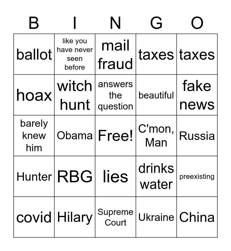 This bingo card has a free space and 24 words: RBG, Hilary, answers the question, covid, taxes, ballot, hoax, like you have never seen before, C'mon, Man, lies, beautiful, barely knew him, drinks water, preexisting, witch hunt, Ukraine, Russia, mail fraud, fake news, Obama, China, Hunter, taxes and Supreme Court.