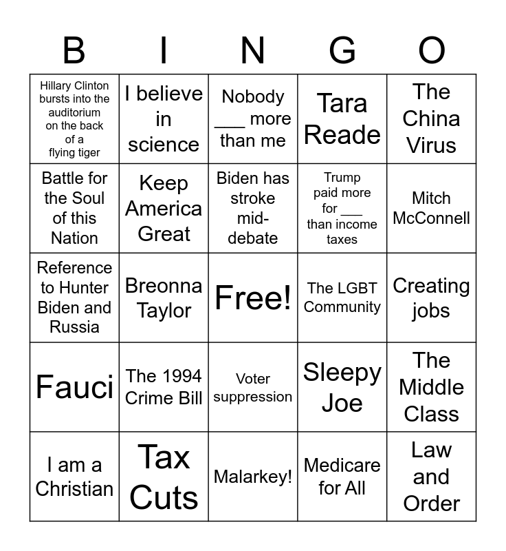 This bingo card has a free space and 47 words: Wrong!, Law and Order, I respect women, Malarkey!, The 1994 Crime Bill, Some reference to time as Obama's VP, I believe in science, YUUGE, Battle for the Soul of this Nation, The Hyde Amendment, Keep America Great, Tara Reade, The Middle Class, Sleepy Joe, Trump sniffs intensely, Look, Chris..., Biden has stroke mid-debate, The LGBT Community, Impeachment, The China Virus, Breonna Taylor, Medicare for All, Hillary Clinton bursts into the auditorium on the back of a flying tiger, Trump paid more for ___ than income taxes, Black Lives Matter, Mitch McConnell, I am a Christian, Women of Color, Voter suppression, Fauci, Maybe the best ever, Trump makes "ok" sign with hands, Amy Coney Barrett, Ruth Bader Ginsburg, White Supremacy, Tax Cuts, Creating jobs, Chris Wallace begs audience to stay silent, Outrageously funny Biden gaffe, Biden asks Trump if he will concede the election, Fake News!, Nobody ___ more than me, Reference to Hunter Biden and Russia, Disproportionately affects [insert minority group], Women's right to choose, Over 200,000 deaths and I put a travel ban on China before anyone else would.