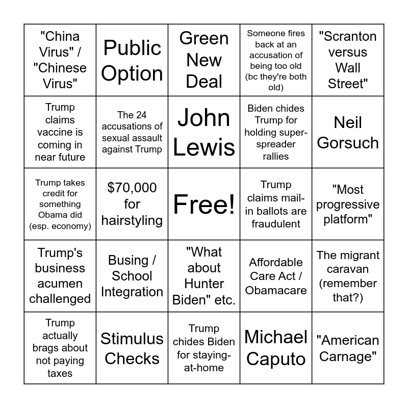 This bingo card has a free space and 100 words: Biden makes a mostly harmless, but overdramatized verbal gaffe, $750 in taxes, "Most progressive platform", Trump praises OANN, Pre-existing conditions, Mask Mandate, Trump calls Biden a socialist, Kenosha, Biden denies supporting defunding the police, Hates on CNN, Malarky, 1994 Crime Bill, FAKE NEWS!, Stimulus Checks, NAFTA/USMCA, Hillary Clinton, Biden chides Trump for holding super-spreader rallies, Kamala Harris, Biden mentions Medicare-for-All, Brett Kavanaugh, "Battle for the Soul of the Nation", Ivanka: the tax double-dipper, Airline Bailout, Trump's Tulsa rally, Hates on New York Times, Trump claims mail-in ballots are fraudulent, "Scranton versus Wall Street", Affordable Care Act / Obamacare, Trump claims anti-Catholic discrimination against A.C.B., Anthony Fauci, $70,000 for hairstyling, "China Virus" / "Chinese Virus", Uncle Joe, Great Recession, Michael Caputo, John Lewis, The migrant caravan (remember that?), Hydroxychloroquine, "Great American Comeback", George Floyd, Impeachment?, Travel ban from China, Trump takes credit for something Obama did (esp. economy), Trump complains about the mic, Neil Gorsuch, Green New Deal, Kyle Rittenhouse, "C'mon man", Trump refers to President Kamala Harris, Trump chides Biden for staying-at-home, Trump refuses to release his tax returns, Hates on Washington Post, "3 million illegal immigrants voted for Clinton", Mail-in ballots, Unemployment Checks, Jacob Blake, Repeal-and-replace Obamacare, Ruth Bader Ginsburg, Trump mentions Antifa, Someone fires back at an accusation of being too old (bc they're both old), Conservative super-majority, Trump calls for an ear check, Trump's loans from foreign countries, Anita Hill, IRS audit, Amy Coney Barrett, "I paid more in taxes than Donald Trump", Trump claims Biden supports defunding the police, Barack Obama, 6% COVID death rate conspiracy theory, *Trump sniffs into mic loudly*, Busing / School Integration, Joe's Different Deal (from Green New Deal), Complaints about media being mean to him, Roe v. Wade, Jobs Numbers (selectively forgetting 2020), Trump whines (another free space), Trump claims vaccine is coming in near future, Trump denies trying to get rid of pre-existing condition protections, "Shithole Countries", Trump calls Chris Wallace biased, "American Carnage", Noncommittal about transfer of power, "What about Hunter Biden" etc., "In Joe Biden's America..." (while referring to Donald Trump's America), Public Option, "Injecting disinfectant", Trump challenges Biden to IQ test, "Mainstream Media" / "Lamestream Media", Trump's business acumen challenged, Hates on Fox News, Trump calls protesters "thugs", 200,000 dead from COVID, Trump actually brags about not paying taxes, The 24 accusations of sexual assault against Trump, Iraq War, Trump thinks vote-by-mail and absentee are different, Trump calls for a drug test, Biden-Sanders unity platform and HHS altering CDC reports.
