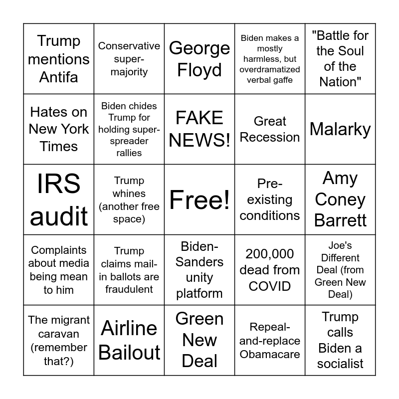 This bingo card has a free space and 100 words: 6% COVID death rate conspiracy theory, Biden mentions Medicare-for-All, Amy Coney Barrett, Affordable Care Act / Obamacare, Noncommittal about transfer of power, "3 million illegal immigrants voted for Clinton", Hates on Washington Post, "Great American Comeback", Iraq War, Kenosha, Hillary Clinton, Trump complains about the mic, The 24 accusations of sexual assault against Trump, Airline Bailout, Stimulus Checks, Trump's loans from foreign countries, Great Recession, Trump calls for an ear check, $70,000 for hairstyling, "Most progressive platform", Trump calls Chris Wallace biased, "In Joe Biden's America..." (while referring to Donald Trump's America), Roe v. Wade, Trump claims Biden supports defunding the police, Uncle Joe, Pre-existing conditions, "Battle for the Soul of the Nation", 200,000 dead from COVID, Trump refuses to release his tax returns, Michael Caputo, Trump whines (another free space), Trump mentions Antifa, "Shithole Countries", Hates on Fox News, Repeal-and-replace Obamacare, FAKE NEWS!, Joe's Different Deal (from Green New Deal), "Injecting disinfectant", Trump's business acumen challenged, Neil Gorsuch, Jobs Numbers (selectively forgetting 2020), Mail-in ballots, IRS audit, Trump claims vaccine is coming in near future, Malarky, George Floyd, Trump chides Biden for staying-at-home, Ruth Bader Ginsburg, NAFTA/USMCA, Green New Deal, Trump calls for a drug test, Biden denies supporting defunding the police, Busing / School Integration, Kamala Harris, Trump thinks vote-by-mail and absentee are different, Trump refers to President Kamala Harris, "C'mon man", Unemployment Checks, Hates on CNN, Biden makes a mostly harmless, but overdramatized verbal gaffe, Someone fires back at an accusation of being too old (bc they're both old), "I paid more in taxes than Donald Trump", Ivanka: the tax double-dipper, "Mainstream Media" / "Lamestream Media", Trump challenges Biden to IQ test, Kyle Rittenhouse, Trump actually brags about not paying taxes, Trump praises OANN, Barack Obama, Trump's Tulsa rally, "Scranton versus Wall Street", Trump claims mail-in ballots are fraudulent, Jacob Blake, "What about Hunter Biden" etc., Public Option, Hydroxychloroquine, Trump claims anti-Catholic discrimination against A.C.B., Hates on New York Times, Impeachment?, Anita Hill, 1994 Crime Bill, Trump calls Biden a socialist, Mask Mandate, Biden-Sanders unity platform, *Trump sniffs into mic loudly*, Conservative super-majority, Trump calls protesters "thugs", "American Carnage", HHS altering CDC reports, Complaints about media being mean to him, John Lewis, $750 in taxes, Trump denies trying to get rid of pre-existing condition protections, The migrant caravan (remember that?), Biden chides Trump for holding super-spreader rallies, Brett Kavanaugh, Trump takes credit for something Obama did (esp. economy), "China Virus" / "Chinese Virus", Anthony Fauci and Travel ban from China.