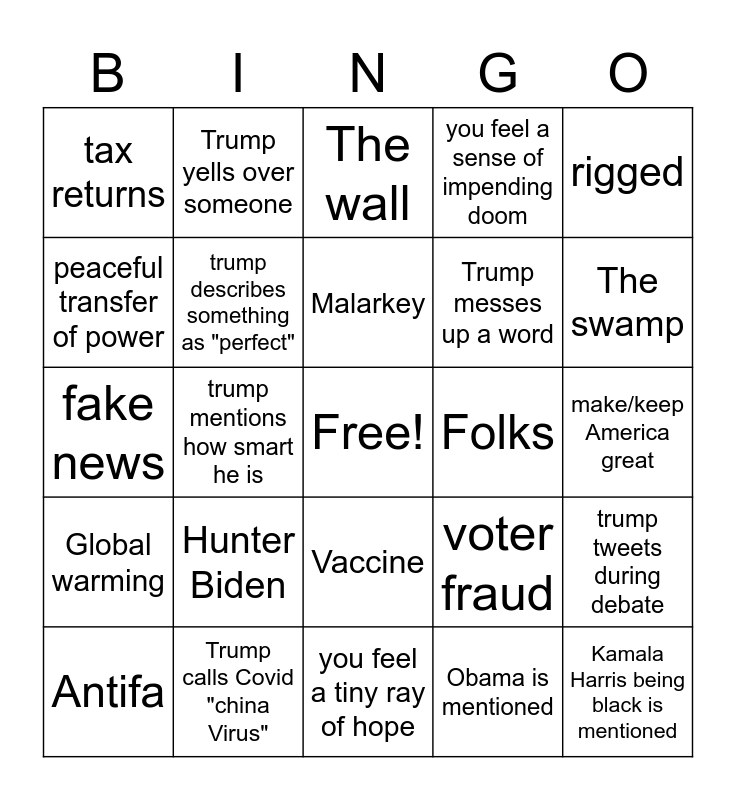 This bingo card has a free space and 24 words: Hunter Biden, Trump calls Covid "china Virus", Malarkey, Antifa, rigged, tax returns, peaceful transfer of power, Trump yells over someone, Folks, Vaccine, Trump messes up a word, fake news, voter fraud, trump tweets during debate, trump describes something as "perfect", Obama is mentioned, make/keep America great, The wall, The swamp, trump mentions how smart he is, Kamala Harris being black is mentioned, Global warming, you feel a sense of impending doom and you feel a tiny ray of hope.