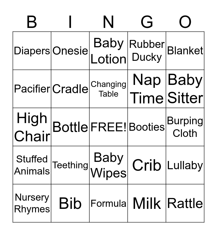 This bingo card has a free space and 24 words: Teething, Bib, Changing Table, Nursery Rhymes, Blanket, Diapers, Pacifier, Onesie, Booties, Baby Wipes, Nap Time, High Chair, Crib, Lullaby, Cradle, Milk, Burping Cloth, Baby Lotion, Baby Sitter, Bottle, Rattle, Stuffed Animals, Rubber Ducky and Formula.