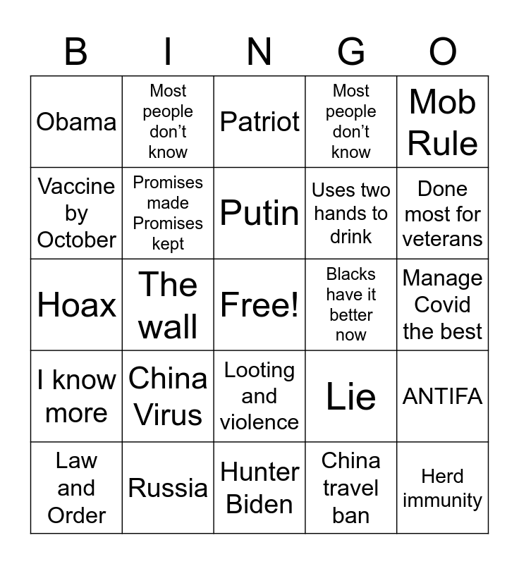 This bingo card has a free space and 24 words: China Virus, Russia, Putin, Law and Order, Mob Rule, Obama, Vaccine by October, Most people don’t know, Blacks have it better now, Looting and violence, Uses two hands to drink, Hoax, Lie, ANTIFA, Promises made Promises kept, China travel ban, Manage Covid the best, Patriot, Done most for veterans, The wall, Herd immunity, I know more, Most people don’t know and Hunter Biden.