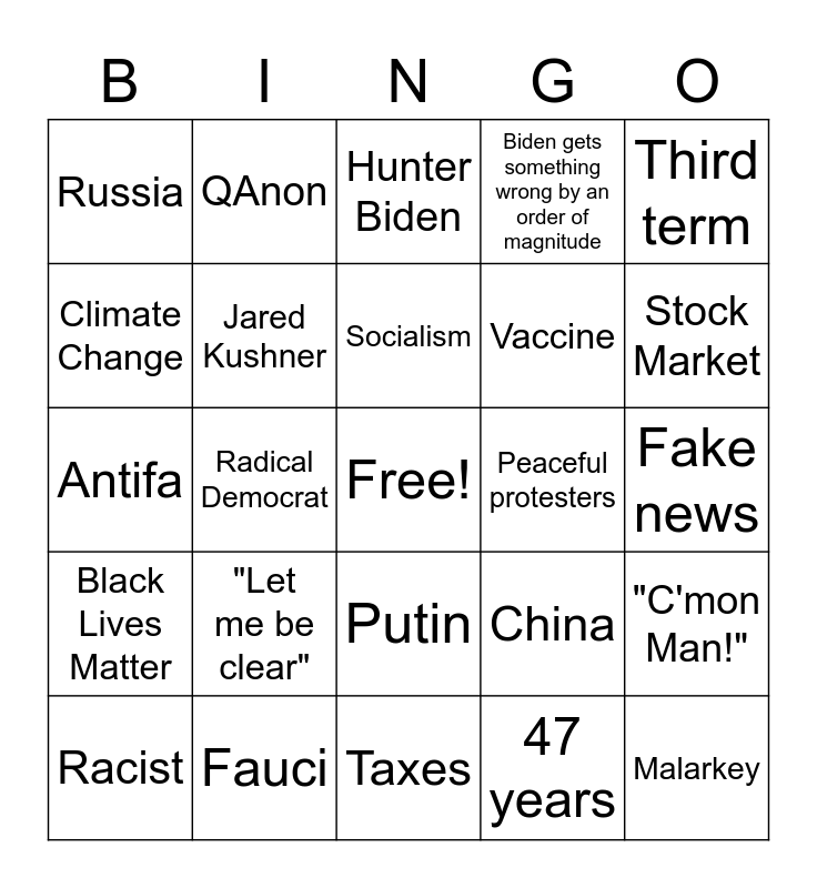 This bingo card has a free space and 31 words: Taxes, Sleepy Joe, Radical Democrat, COVID-19, Russia, Hunter Biden, Jared Kushner, China, Peaceful protesters, 47 years, Fake news, Malarkey, Supreme Court, Trump describes something as "perfect", Stock Market, Make/Keep America Great, "C'mon Man!", "Let me be clear", Black Lives Matter, Putin, Third term, Voter fraud, Racist, QAnon, Vaccine, Climate Change, Biden gets something wrong by an order of magnitude, Antifa, Fauci, Socialism and Chinavirus.