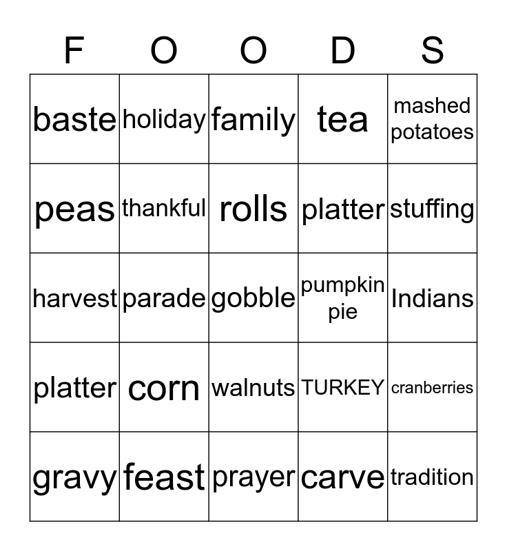 This bingo card has 25 words: corn, prayer, rolls, gravy, mashed potatoes, baste, peas, holiday, pumpkin pie, walnuts, platter, harvest, TURKEY, cranberries, thankful, tradition, Indians, family, stuffing, parade, gobble, feast, platter, tea and carve.