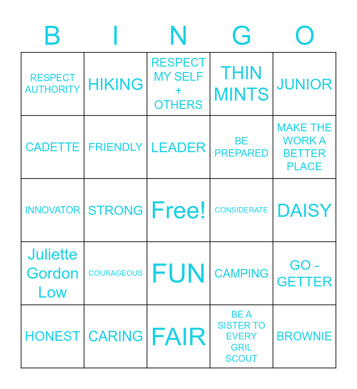 This bingo card has a free space and 29 words: HONEST, USE RESOURCES WISELY, STRONG, RESPONSIBLE FOR WHAT I SAY + DO, RESPECT AUTHORITY, RESPECT MY SELF + OTHERS, FRIENDLY, COURAGEOUS, CONSIDERATE, CARING, DAISY, BROWNIE, FAIR, BE A SISTER TO EVERY GRIL SCOUT, MAKE THE WORK A BETTER PLACE, HELPFUL, FUN, Juliette Gordon Low, JUNIOR, INNOVATOR, CAMPING, ART, BE PREPARED, CADETTE, THIN MINTS, HIKING, GO -GETTER, LEADER and RISK TAKER.