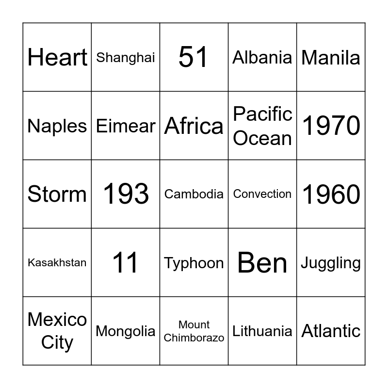 This bingo card has 25 words: 11, Mount Chimborazo, Africa, Mexico City, Manila, Heart, Naples, Shanghai, Convection, Typhoon, Pacific Ocean, Storm, Ben, Juggling, Eimear, Atlantic, 1960, 51, 1970, 193, Cambodia, Mongolia, Kasakhstan, Albania and Lithuania.