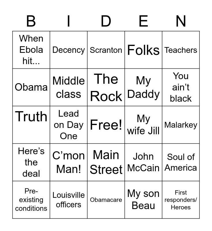 This bingo card has a free space and 24 words: C’mon Man!, Louisville officers, The Rock, Pre-existing conditions, Teachers, When Ebola hit..., Obama, Decency, My wife Jill, Main Street, My Daddy, Truth, John McCain, Soul of America, Middle class, My son Beau, Malarkey, Scranton, You ain’t black, Lead on Day One, First responders/ Heroes, Here’s the deal, Folks and Obamacare.