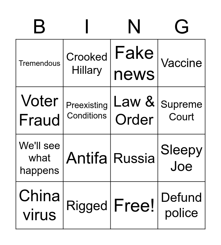 This bingo card has 17 words: Free!, China virus, Fake news, Tremendous, Antifa, Vaccine, Sleepy Joe, Law & Order, Supreme Court, Preexisting Conditions, Rigged, Russia, Voter Fraud, Crooked Hillary, We'll see what happens, The Wall and Defund police.