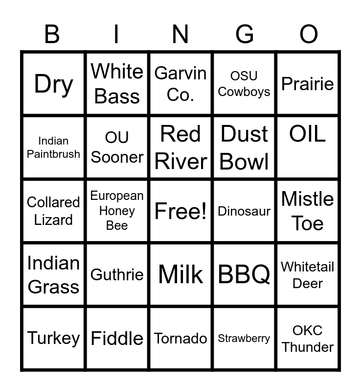 This bingo card has a free space and 34 words: Oklahoma City, Scissortail, Bison, Rose Rock, Mistle Toe, Indian Paintbrush, OU Sooner, Tornado, Dust Bowl, OKC Thunder, Collared Lizard, White Bass, Strawberry, Redbud, Indian Grass, European Honey Bee, Milk, Dinosaur, Whitetail Deer, Turkey, Fiddle, Watermelon, OSU Cowboys, OIL, Rose, Guthrie, Garvin Co., Frontier, Prairie, Dry, Plains, Red River, BBQ and Corn.