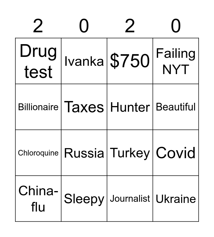 This bingo card has 20 words: Covid, Cornavirus, $750, Fake, China-flu, Billionaire, Sleepy, Drug test, Chloroquine, Ivanka, Russia, Turkey, Taxes, Ukraine, Hunter, Impeachment, Beautiful, Failing NYT, Journalist and Mailing in ballots.