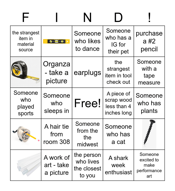This bingo card has 5 images, a free space and 19 words: A hair tie from room 308, A work of art - take a picture, earplugs, purchase a #2 pencil, the strangest item in material source, A piece of scrap wood less than 4 inches long, Someone from the the midwest, the strangest item in tool check out, Someone who played sports, Someone who has a cat, Organza - take a picture, A shark week enthusiast, Someone who has plants, Someone who likes to dance, Someone with a tape measure, Someone who sleeps in, Someone excited to make performance art, Someone who has a IG for their pet and the person who lives the closest to you.