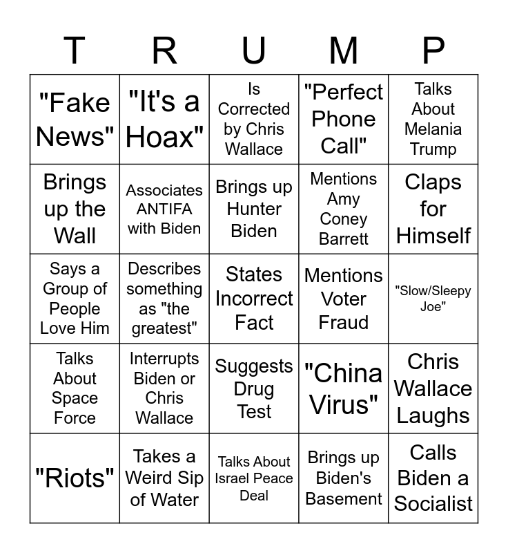 This bingo card has a free space and 24 words: Interrupts Biden or Chris Wallace, Takes a Weird Sip of Water, Brings up Hunter Biden, "Riots", Talks About Melania Trump, "Fake News", Brings up the Wall, "It's a Hoax", Mentions Voter Fraud, Suggests Drug Test, Mentions Amy Coney Barrett, Says a Group of People Love Him, "China Virus", Chris Wallace Laughs, Associates ANTIFA with Biden, Brings up Biden's Basement, "Slow/Sleepy Joe", Is Corrected by Chris Wallace, Claps for Himself, Describes something as "the greatest", Calls Biden a Socialist, Talks About Space Force, "Perfect Phone Call" and Talks About Israel Peace Deal.