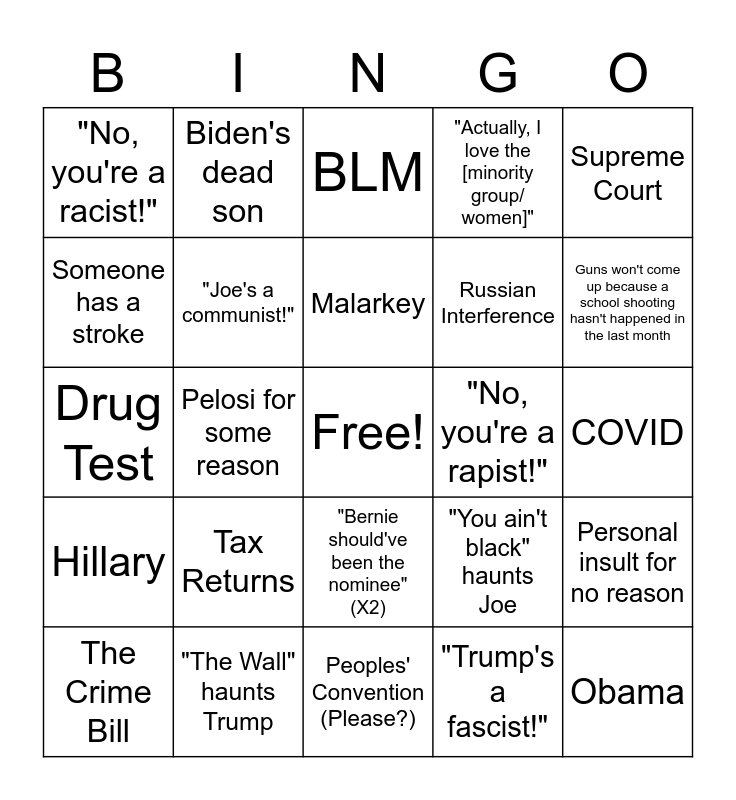 This bingo card has a free space and 24 words: Tax Returns, "The Wall" haunts Trump, Malarkey, The Crime Bill, Supreme Court, "No, you're a racist!", Someone has a stroke, Biden's dead son, "No, you're a rapist!", "Bernie should've been the nominee" (X2), Russian Interference, Drug Test, "You ain't black" haunts Joe, Personal insult for no reason, "Joe's a communist!", "Trump's a fascist!", COVID, BLM, Guns won't come up because a school shooting hasn't happened in the last month, Pelosi for some reason, Obama, Hillary, "Actually, I love the [minority group/ women]" and Peoples' Convention (Please?).