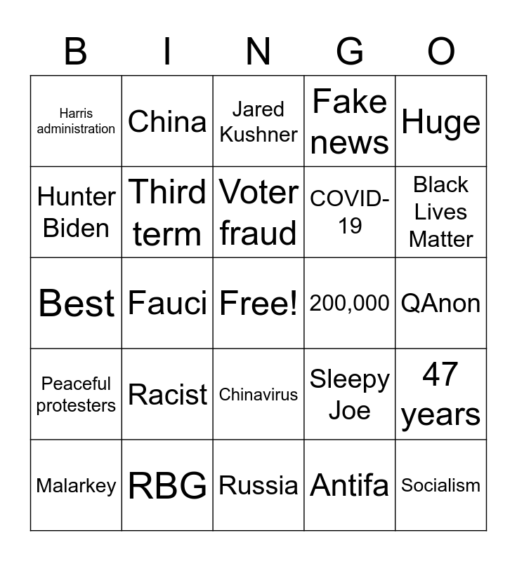 This bingo card has a free space and 27 words: Sleepy Joe, Radical Democrat, COVID-19, Russia, Hunter Biden, Jared Kushner, China, Peaceful protesters, 200,000, 47 years, Best, Fake news, Malarkey, RBG, Black Lives Matter, Putin, Third term, Voter fraud, Racist, Harris administration, QAnon, Antifa, Fauci, Socialism, Chinavirus, Huge and Folks.