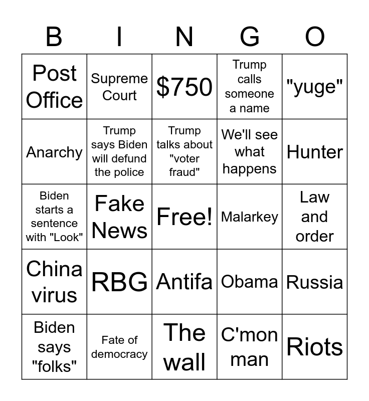 This bingo card has a free space and 24 words: RBG, Fate of democracy, Trump talks about "voter fraud", Biden says "folks", "yuge", Post Office, Anarchy, Supreme Court, Malarkey, Antifa, We'll see what happens, Biden starts a sentence with "Look", Obama, Russia, Trump says Biden will defund the police, C'mon man, Law and order, $750, Hunter, Fake News, Riots, China virus, Trump calls someone a name and The wall.