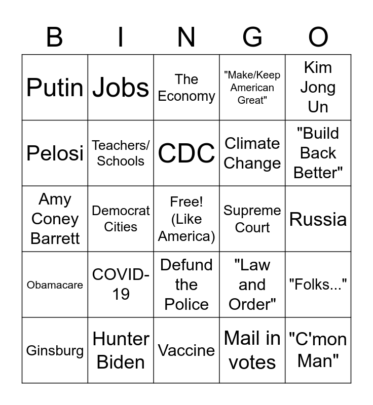 This bingo card has a free space and 29 words: Ginsburg, Tax Returns, Democrat Cities, ANTIFA, Putin, The Economy, Teachers/ Schools, COVID-19, Supreme Court, Hunter Biden, Russia, "C'mon Man", Vaccine, Mail in votes, "Build Back Better", Fake News, Defund the Police, Obamacare, Kim Jong Un, Amy Coney Barrett, "Law and Order", Black Lives Matter, Climate Change, Pelosi, "Make/Keep American Great", Jobs, "Folks...", CDC and The Middle Class.