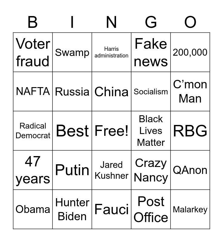 This bingo card has a free space and 41 words: Sleepy Joe, Radical Democrat, COVID-19, Russia, Hunter Biden, Jared Kushner, China, Peaceful protesters, 200,000, 47 years, Best, Fake news, Malarkey, RBG, Black Lives Matter, Putin, Third term, Voter fraud, Racist, Harris administration, QAnon, Antifa, Fauci, Socialism, Chinavirus, Yuge, Post Office, Ballot Harvesting, C’mon Man, ACBarrett, Mask mandate, Swamp, Obama, Hilary, Crazy Nancy, NAFTA, Pre-existing conditions, Jobs, Pro-life, Women’s rights and LGBTQ.