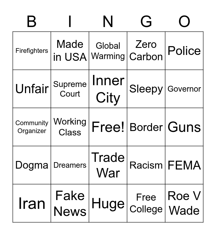 This bingo card has a free space and 93 words: Great, America, Huge, Collusion, Russia, Comey, Kamala, Iran, Empathy, Kids, ObamaCare, Black Lives, Crazy, Sleepy, President, Police, Global Warming, Jobs, Government, The Wall, Beautiful, Masks, Covid, Israel, Dreamers, Supreme Court, Amy, McConnell, Nancy, Press, Fake News, Trade War, China, Nuclear, Made in USA, Social Security, Latinos, Country, Inner City, Racism, Community Organizer, Dogma, Guns, Constitution, Roe V Wade, Planned Parenthood, Alien, Mail-in Ballot, Steal, Liar, Tax the Rich, Free College, Pre-existing Condition, Socialist, Extreme Right, Fox News, Website, Economy, Stock Market, Ruth Bader Ginsberg, Working Class, Drugs, Mental Health, Green New Deal, United Nations, Respect, The Flag, Under God, Unfair, Democracy, Putin, Golf, Pandemic, Zero Carbon, Voter Fraud, Social Distancing, Governor, FEMA, Military, Veterans, Working poor, Undocumented Worker, Border, Firefighters, Babies, Hand-out, Hand-up, I've been there, Truth, Coal, Vote, Antifa and Breana.