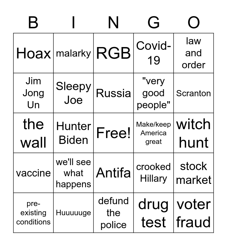 This bingo card has a free space and 33 words: China virus, tax returns, Hunter Biden, fake news, vaccine, Sleepy Joe, law and order, pre-existing conditions, malarky, rigged, Russia, RGB, Ukraine, Obamacare, Make/keep America great, Scranton, Huuuuuge, the wall, we'll see what happens, crooked Hillary, Antifa, Putin, Hoax, witch hunt, defund the police, voter fraud, Covid-19, "very good people", Jim Jong Un, stock market, "Folks...", drug test and Supreme Court.