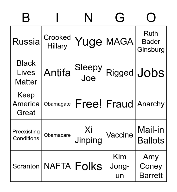 This bingo card has a free space and 49 words: Malarkey, Amy Coney Barrett, Trump's Taxes, Folks, Obamacare, Stock Market, Crooked Hillary, China Virus, Black Lives Matter, Putin, Antifa, MAGA, Mail-in Ballots, Vaccine, Hunter Biden, Fauci, Sleepy Joe, Fraud, Supreme Court, Ruth Bader Ginsburg, Obamagate, Kim Jong-un, Russia, Rigged, Impeachment, Jobs, Scranton, "Folks...", Xi Jinping, Preexisting Conditions, Drug test, Earpiece, Defund The Police, Middle Class, NAFTA, Trump sniffles, Biden gaffes, "Come on, man", Anarchy, Merrick Garland, George Floyd, Breonna Taylor, Kamala, "Soul of the nation", Keep America Great, Yuge, Masks, Dementia and "My friend".