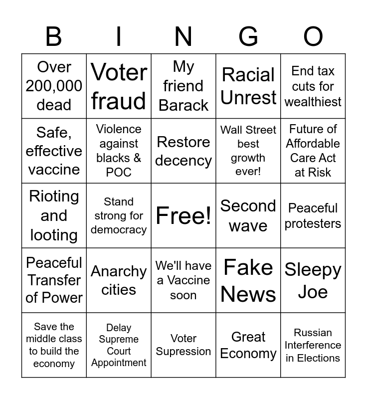 This bingo card has a free space and 29 words: Save the middle class to build the economy, Next Pres & Sen. should appoint SCJ, Stand strong for democracy, Mail in ballots, Over 200,000 dead, My friend Barack, Violence against blacks & POC, Anarchy cities, Second wave, Delay Supreme Court Appointment, Peaceful protesters, Russian Interference in Elections, Voter Supression, Great Economy, Future of Affordable Care Act at Risk, Respect Ginsberg's last wish., We'll have a Vaccine soon, Peaceful Transfer of Power, End tax cuts for wealthiest, Rioting and looting, Fake News, Great Covid Response, Wall Street best growth ever!, Safe, effective vaccine, Racial Unrest, Voter fraud, Sleepy Joe, Restore decency and We'll have a better health care plan..