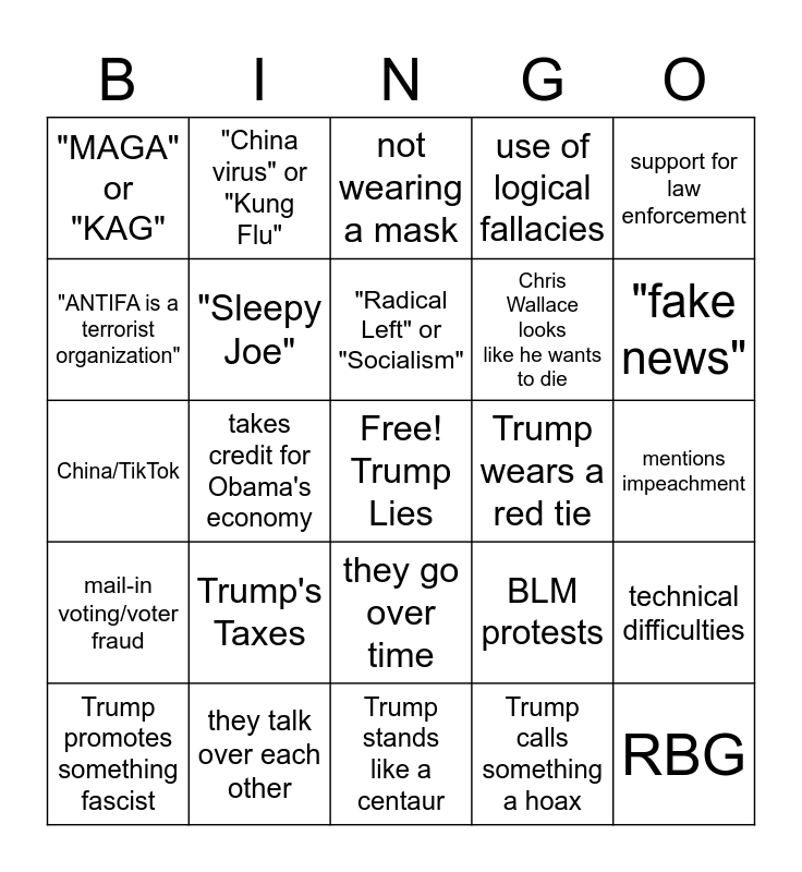 This bingo card has a free space and 24 words: Trump's Taxes, they talk over each other, "Radical Left" or "Socialism", Trump promotes something fascist, support for law enforcement, "MAGA" or "KAG", "ANTIFA is a terrorist organization", "China virus" or "Kung Flu", Trump wears a red tie, they go over time, Chris Wallace looks like he wants to die, China/TikTok, BLM protests, technical difficulties, "Sleepy Joe", Trump calls something a hoax, mentions impeachment, not wearing a mask, "fake news", takes credit for Obama's economy, RBG, mail-in voting/voter fraud, use of logical fallacies and Trump stands like a centaur.