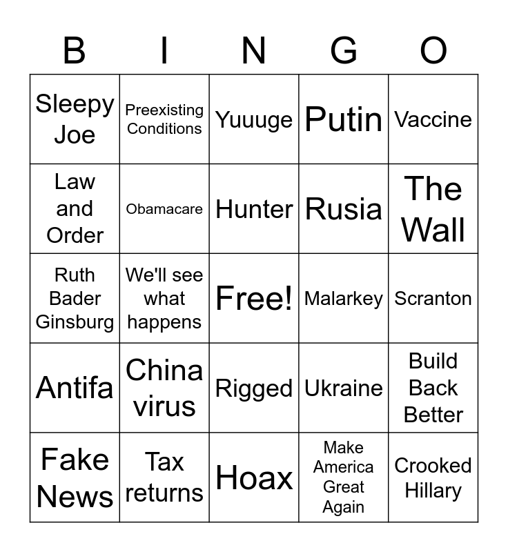 This bingo card has a free space and 24 words: China virus, Tax returns, Hunter, Fake News, Vaccine, Sleepy Joe, Law and Order, Preexisting Conditions, Malarkey, Rigged, Rusia, Ruth Bader Ginsburg, Ukraine, Build Back Better, Obamacare, Make America Great Again, Scranton, Yuuuge, The Wall, We'll see what happens, Crooked Hillary, Antifa, Putin and Hoax.