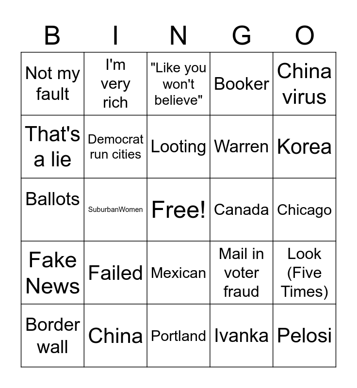 This bingo card has a free space and 33 words: Tremendous, Hillary, SuburbanWomen, Black people love me, Fake News, Democrat run cities, China virus, Border wall, I'm very rich, It'll cool down, Looting, "Like you won't believe", Russia, Obama, Canada, Korea, China, Ballots, Failed, Mail in voter fraud, Mexican, Stock market, Not my fault, Chicago, Portland, Pelosi, Booker, Warren, That's a lie, Look (Five Times), Eric, Ivanka and Immigrants.