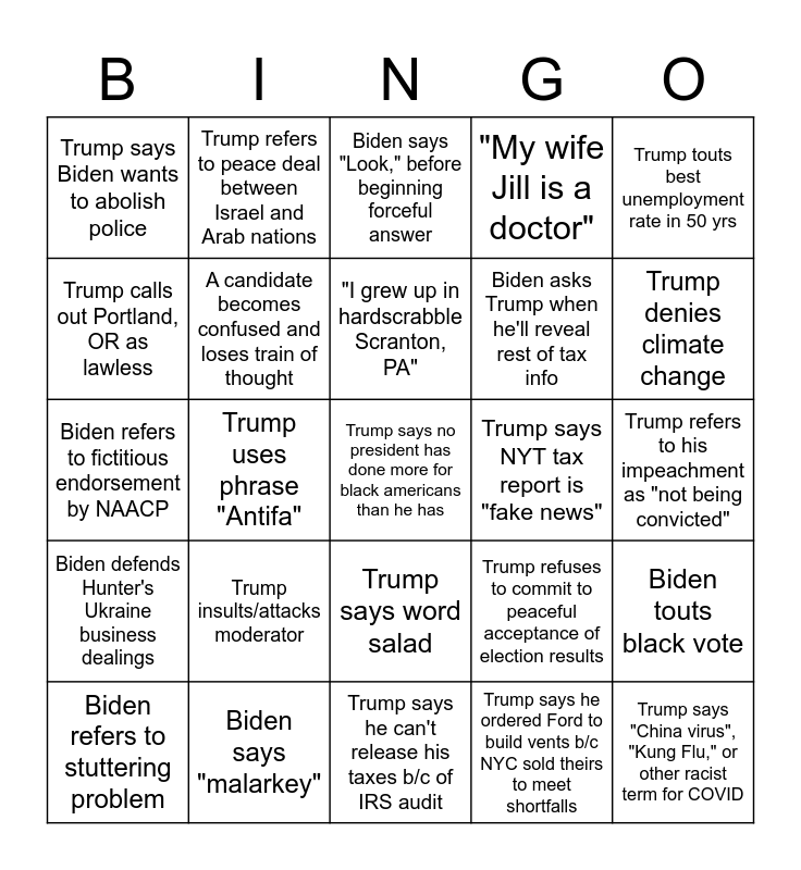 This bingo card has 30 words: Biden says "malarkey", Trump says COVID-19 is exaggerated, Trump uses phrase "Antifa", Trump says COVID hotspots are in blue places, Trump says Biden wants to abolish police, Biden says "Look," before beginning forceful answer, A candidate becomes confused and loses train of thought, Trump says word salad, Trump says NYT tax report is "fake news", Trump says he can't release his taxes b/c of IRS audit, Trump refers to his impeachment as "not being convicted", Trump says no president has done more for black americans than he has, Trump says he ordered Ford to build vents b/c NYC sold theirs to meet shortfalls, Trump says "China virus", "Kung Flu," or other racist term for COVID, Trump denies climate change, "Soup for their families", Trump refuses to commit to peaceful acceptance of election results, Biden defends Hunter's Ukraine business dealings, Trump insults/attacks moderator, Trump touts best unemployment rate in 50 yrs, Biden refers to fictitious endorsement by NAACP, Trump refers to "caravans" of illegal immigrants, Trump refers to peace deal between Israel and Arab nations, Biden asks Trump when he'll reveal rest of tax info, Trump calls out Portland, OR as lawless, "My wife Jill is a doctor", Biden touts black vote, Biden refers to stuttering problem, "I grew up in hardscrabble Scranton, PA" and Biden "lobsters up" with anger.