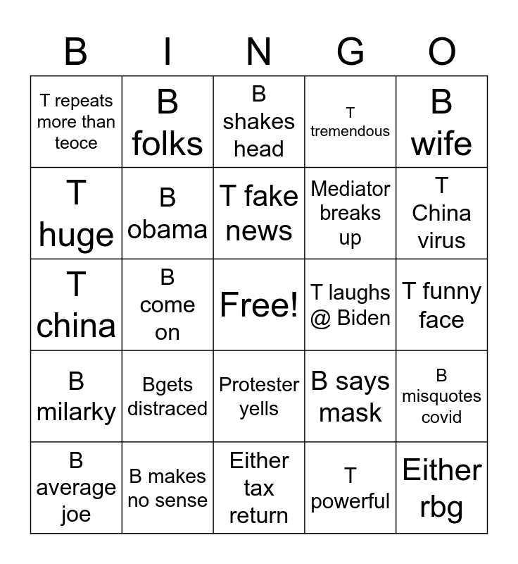 This bingo card has a free space and 24 words: Bgets distraced, B makes no sense, T fake news, B average joe, B wife, T repeats more than teoce, T huge, B folks, T laughs @ Biden, Protester yells, Mediator breaks up, T china, B says mask, B misquotes covid, B obama, T powerful, T funny face, B shakes head, T China virus, B come on, Either rbg, B milarky, T tremendous and Either tax return.
