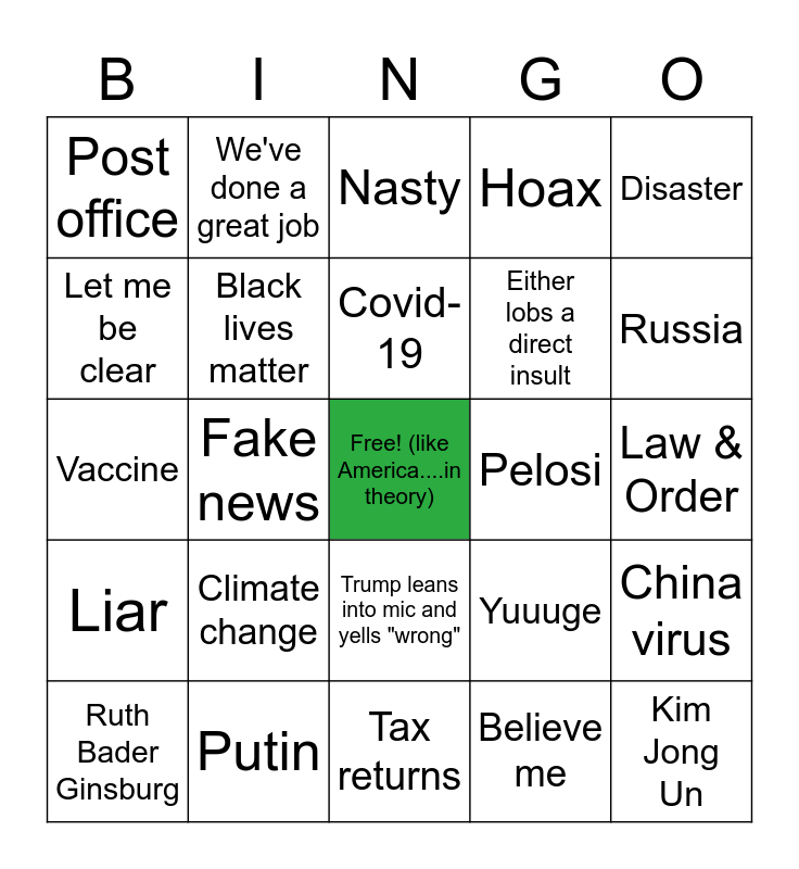 This bingo card has a free space and 38 words: Malarkey, Folks, Biden starts a sentence with "look", Black lives matter, China virus, Climate change, Covid-19, Defund the police, Disaster, Either lobs a direct insult, Fake news, Hoax, Kim Jong Un, Law & Order, Let me be clear, Liar, Make/Keep America Great, Nasty, Obamacare, Pelosi, Post office, Putin, Russia, Ruth Bader Ginsburg, Student debt, Tax returns, The wall, TikTok, Trump bashes Kamala, Trump describes something as "perfect", Trump doubles down on not conceding, Trump leans into mic and yells "wrong", Believe me, We've done a great job, We'll see what happens, Yuuuge, Vaccine and Voter fraud.