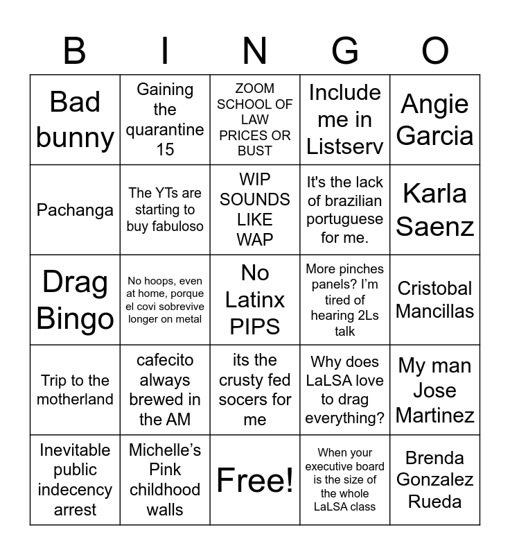 This bingo card has 25 words: Trip to the motherland, Michelle’s Pink childhood walls, No Latinx PIPS, When your executive board is the size of the whole LaLSA class, Angie Garcia, Bad bunny, Gaining the quarantine 15, ZOOM SCHOOL OF LAW PRICES OR BUST, More pinches panels? I’m tired of hearing 2Ls talk, My man Jose Martinez, Pachanga, The YTs are starting to buy fabuloso, Free!, Why does LaLSA love to drag everything?, Karla Saenz, Inevitable public indecency arrest, No hoops, even at home, porque el covi sobrevive longer on metal, WIP SOUNDS LIKE WAP, It's the lack of brazilian portuguese for me., Cristobal Mancillas, Drag Bingo, cafecito always brewed in the AM, its the crusty fed socers for me, Include me in Listserv and Brenda Gonzalez Rueda.