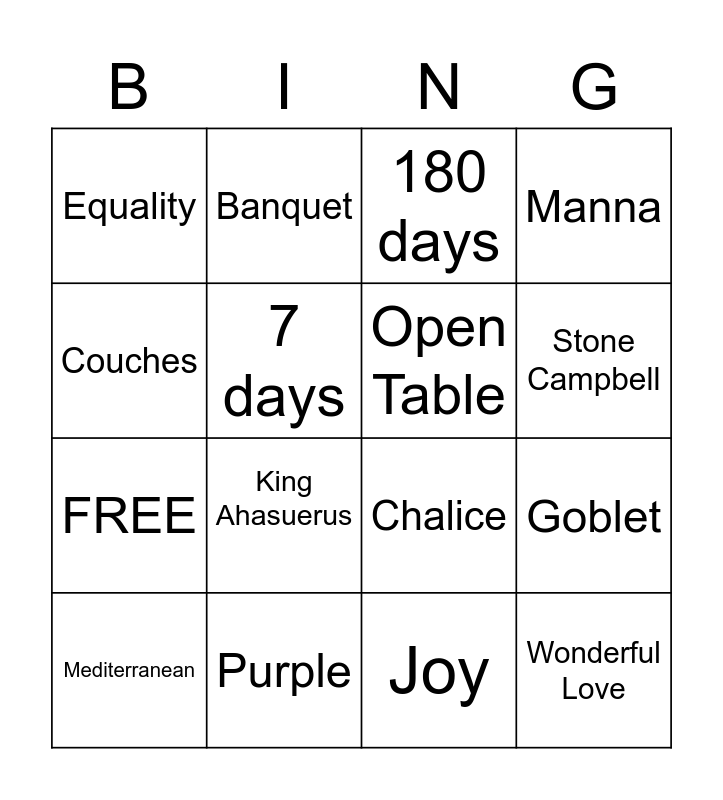 This bingo card has 18 words: King Ahasuerus, Wonderful Love, 180 days, Equality, Chalice, Manna, Mediterranean, Banquet, Stone Campbell, FREE, Joy, Couches, Goblet, 7 days, Open Table, Blue, Purple and Linen.
