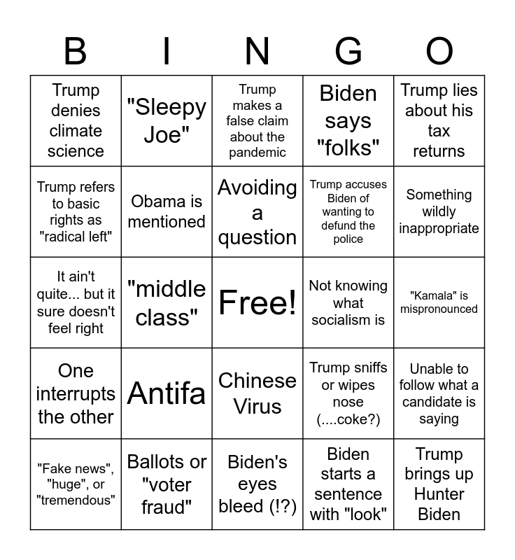 This bingo card has a free space and 24 words: Antifa, Ballots or "voter fraud", Avoiding a question, "Fake news", "huge", or "tremendous", Trump lies about his tax returns, Trump denies climate science, Trump refers to basic rights as "radical left", "Sleepy Joe", Not knowing what socialism is, Chinese Virus, Trump accuses Biden of wanting to defund the police, It ain't quite... but it sure doesn't feel right, Trump sniffs or wipes nose (....coke?), Unable to follow what a candidate is saying, Obama is mentioned, Biden starts a sentence with "look", "Kamala" is mispronounced, Trump makes a false claim about the pandemic, Something wildly inappropriate, "middle class", Trump brings up Hunter Biden, One interrupts the other, Biden says "folks" and Biden's eyes bleed (!?).