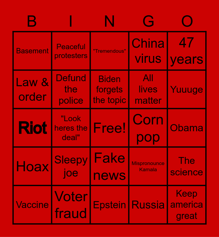 This bingo card has a free space and 24 words: Sleepy joe, Voter fraud, Biden forgets the topic, Vaccine, 47 years, Basement, Law & order, Peaceful protesters, Corn pop, Fake news, All lives matter, Riot, Mispronounce Kamala, The science, Defund the police, Russia, Obama, "Tremendous", Yuuuge, "Look heres the deal", Keep america great, Hoax, China virus and Epstein.