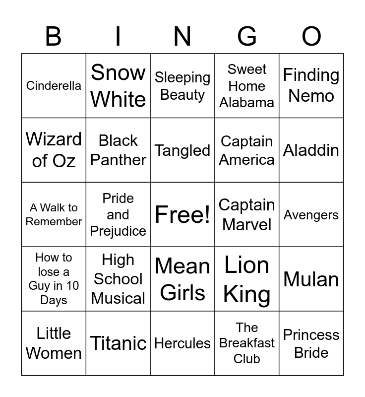 This bingo card has a free space and 40 words: Hitch, A Walk to Remember, Iron Man, Black Panther, Titanic, Mean Girls, Tangled, White Chicks, Finding Nemo, How to lose a Guy in 10 Days, Pride and Prejudice, Sweet Home Alabama, Princess Bride, Avengers, Captain Marvel, High School Musical, Beauty and the Beast, Cinderella, Peter Pan, Sleeping Beauty, Mulan, The Breakfast Club, Captain America, Wizard of Oz, Princess and the Frog, Frozen, Harry Potter, Moana, Jungle Book, Guardians of the Galaxy, The Little Mermaid, Little Women, Remember the Titans, Lion King, Aladdin, Hercules, Lady and the Tramp, Avengers, Snow White and Breakfast at Tiffany's.
