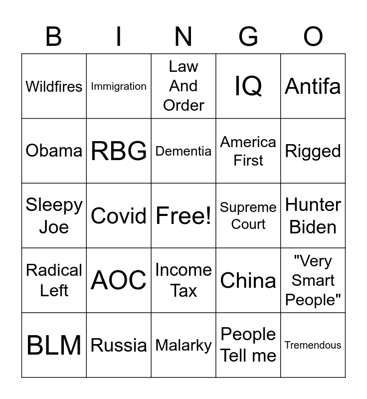 This bingo card has a free space and 40 words: Fake News, Sleepy Joe, Vaccine, RBG, Russia, Income Tax, Dementia, Race, Antifa, Radical Left, Covid, IQ, Tremendous, Hunter Biden, Supreme Court, AOC, Nancy Pelosi, Wildfires, Greta, Law And Order, "Very Smart People", People Tell me, America First, Obama, Hillary Clinton, Investigation, Voter Fraud, Mail In Voting, Police Brutality, Republicans, Democrates, BLM, LGBTQ+, China, Rigged, Malarky, Wall, Caged Children, Immigration and Hoax.