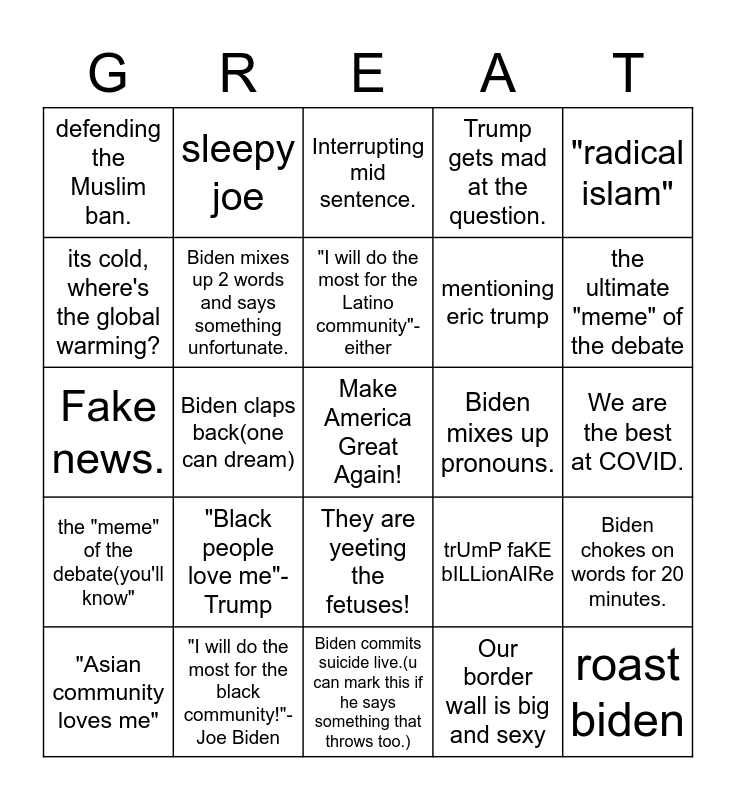 This bingo card has a free space and 24 words: "Black people love me"-Trump, "I will do the most for the black community!"-Joe Biden, "I will do the most for the Latino community"-either, "Asian community loves me", "radical islam", defending the Muslim ban., its cold, where's the global warming?, sleepy joe, Biden mixes up pronouns., They are yeeting the fetuses!, mentioning eric trump, Fake news., trUmP faKE bILLionAIRe, Biden chokes on words for 20 minutes., Biden mixes up 2 words and says something unfortunate., Our border wall is big and sexy, We are the best at COVID., Interrupting mid sentence., the ultimate "meme" of the debate, Biden claps back(one can dream), roast biden, the "meme" of the debate(you'll know", Trump gets mad at the question. and Biden commits suicide live.(u can mark this if he says something that throws too.).