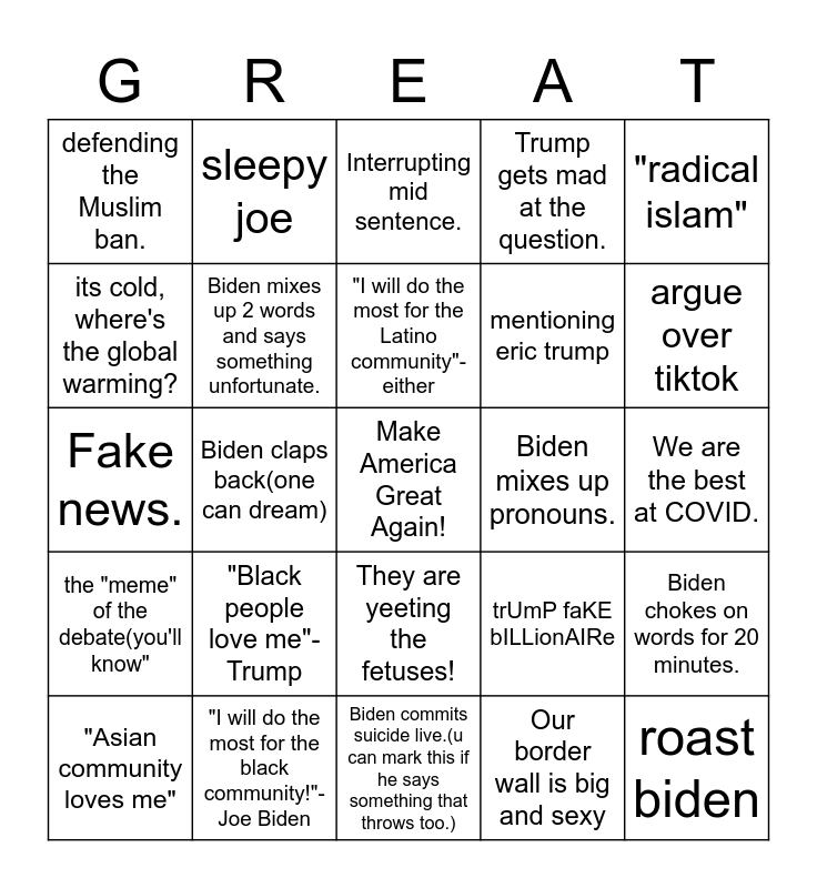 Debate Bingo | Debate 2024 | 2020 'MURICA Debate | 2020 presidential debate | Debate #1